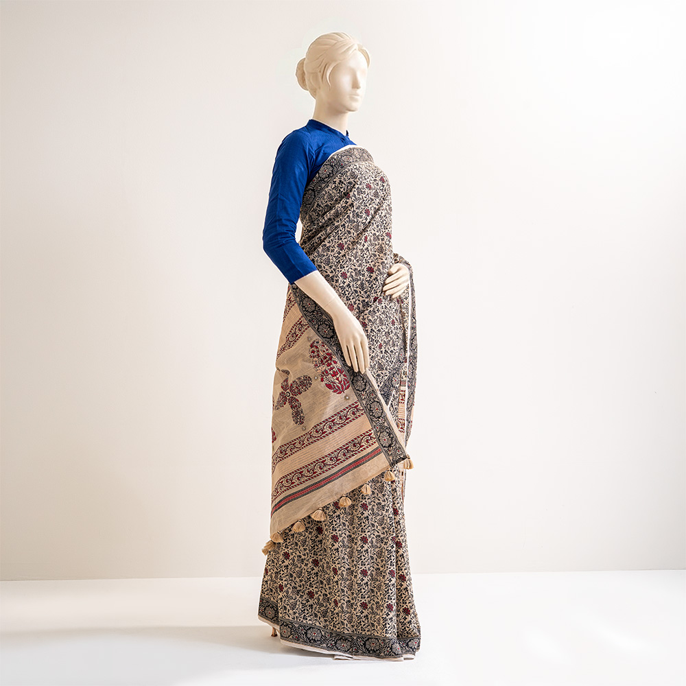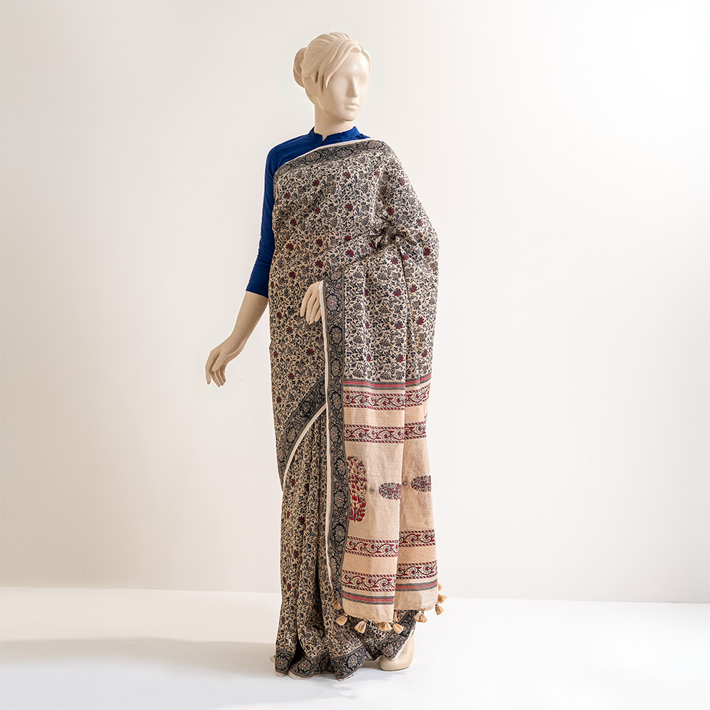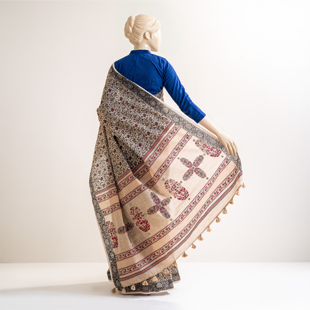 Celebrate timeless tradition with this exquisitely crafted half silk saree. Designed in a soft beige base, it features intricate all-over floral motifs in deep black with subtle red accents, creating a refined and heritage-inspired look.