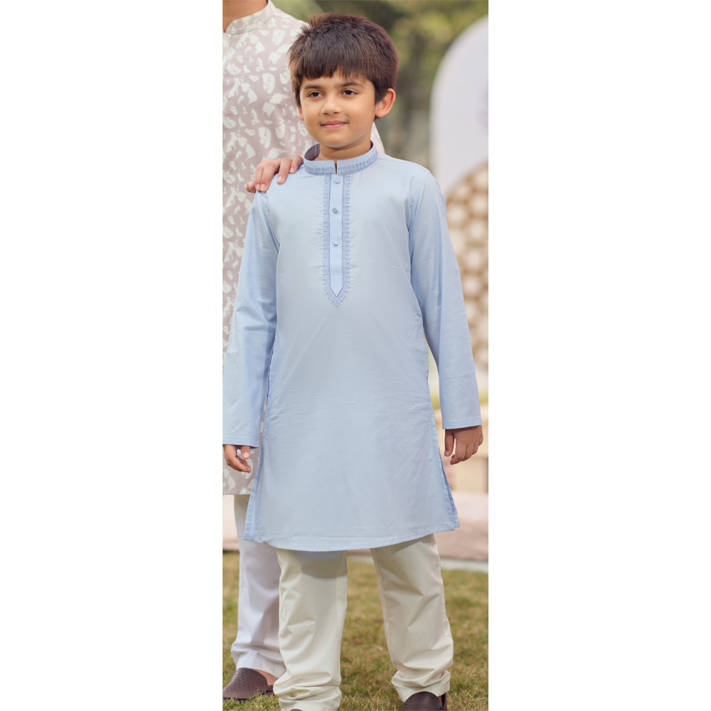 The subtle Sky color adds a refined and sophisticated touch, making it a versatile choice for religious events, family gatherings, cultural programs, and festive celebrations. Designed with a classic silhouette, this Panjabi blends traditional charm with modern comfort, ensuring your boy looks stylish while feeling at ease.