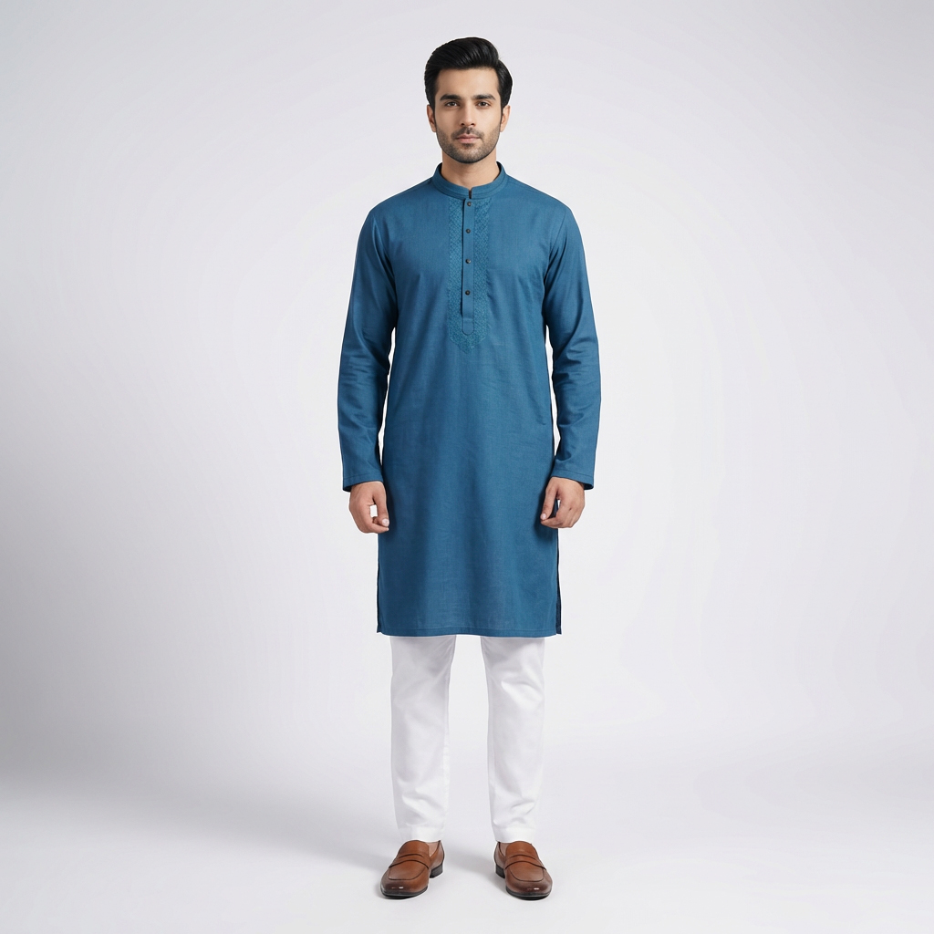 The LUBNAN Men’s Ash-Blue Color Slim Fit Premium Panjabi is a perfect blend of timeless tradition and everyday comfort. Made from high-quality fabric, it ensures breathability and a soft touch, keeping you comfortable throughout the day. The elegant Ash-Blue shade adds a calm yet stylish appeal, making it suitable for cultural events, festive occasions, religious gatherings, or even casual outings. Designed with a slim fit, this Panjabi provides a relaxed and effortless look while maintaining a graceful silhouette. Its classic design highlights simplicity, enhanced by fine stitching and durable craftsmanship that reflect LUBNAN’s signature attention to detail. Versatile and easy to style, it pairs seamlessly with pajama, churidar, or trousers, allowing you to adapt your look for different occasions. Whether worn during special celebrations or as everyday traditional wear, the LUBNAN Ash-Blue slim fit Premium panjabi stands out as a wardrobe essential for men who value tradition, comfort, and elegance.