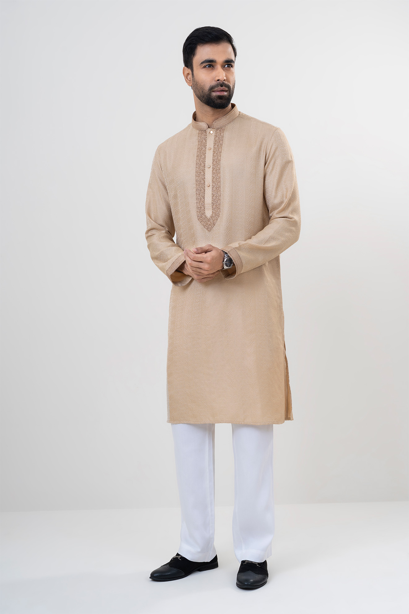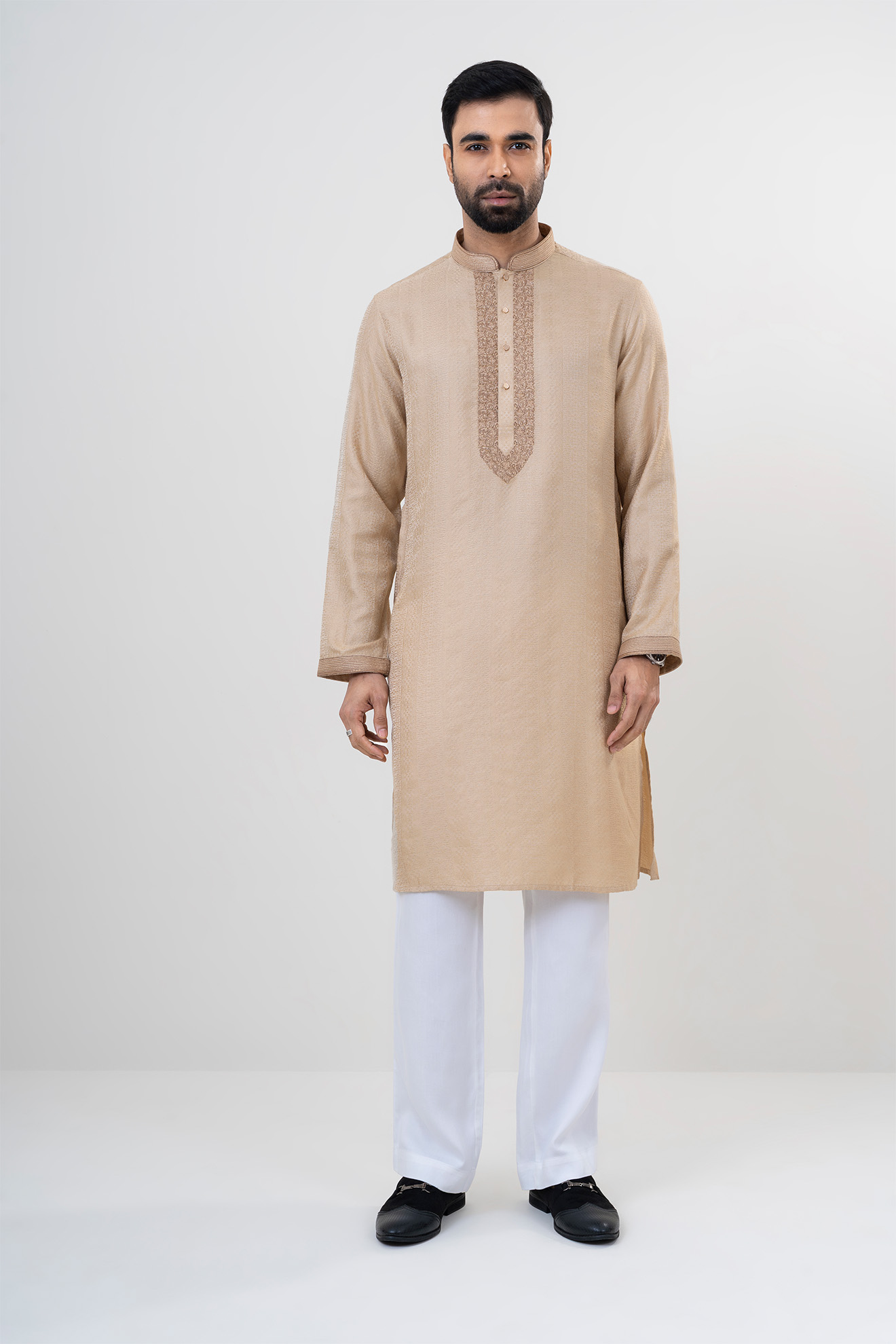The LUBNAN Men’s Biscuit Color Regular Fit Premium Panjabi is a perfect blend of timeless tradition and everyday comfort. Made from high-quality fabric, it ensures breathability and a soft touch, keeping you comfortable throughout the day. The elegant brown shade adds a calm yet stylish appeal, making it suitable for cultural events, festive occasions, religious gatherings, or even casual outings. Designed with a regular fit, this Panjabi provides a relaxed and effortless look while maintaining a graceful silhouette. Its classic design highlights simplicity, enhanced by fine stitching and durable craftsmanship that reflect LUBNAN’s signature attention to detail. Versatile and easy to style, it pairs seamlessly with pajama, churidar, or trousers, allowing you to adapt your look for different occasions. Whether worn during special celebrations or as everyday traditional wear, the LUBNAN regular fit Premium panjabi stands out as a wardrobe essential for men who value tradition, comfort, and elegance.