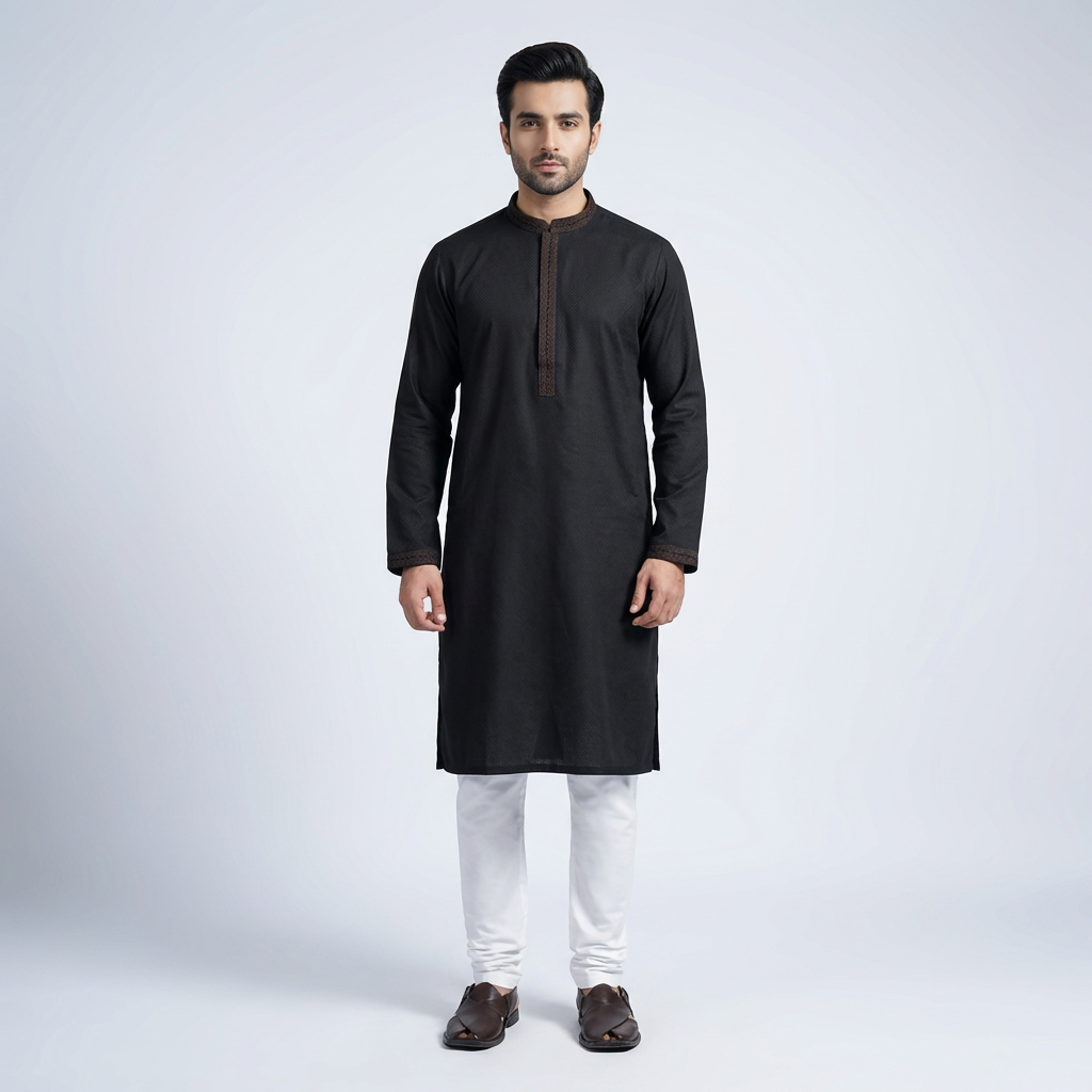 The LUBNAN Men’s Black Color Regular Fit Premium Panjabi is a perfect blend of timeless tradition and everyday comfort. Made from high-quality fabric, it ensures breathability and a soft touch, keeping you comfortable throughout the day. The elegant Black shade adds a calm yet stylish appeal, making it suitable for cultural events, festive occasions, religious gatherings, or even casual outings. Designed with a regular fit, this Panjabi provides a relaxed and effortless look while maintaining a graceful silhouette. Its classic design highlights simplicity, enhanced by fine stitching and durable craftsmanship that reflect LUBNAN’s signature attention to detail. Versatile and easy to style, it pairs seamlessly with pajama, churidar, or trousers, allowing you to adapt your look for different occasions. Whether worn during special celebrations or as everyday traditional wear, the LUBNAN Black regular fit Premium panjabi stands out as a wardrobe essential for men who value tradition, comfort, and elegance.