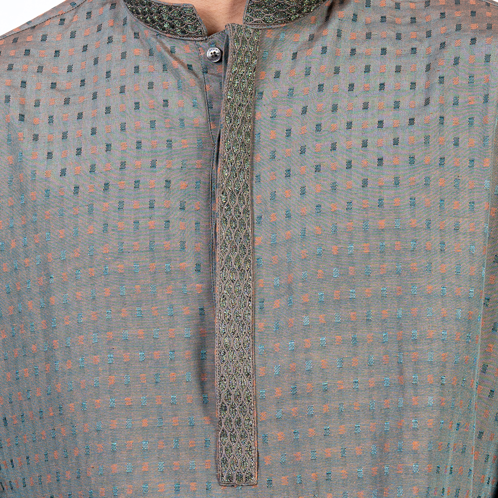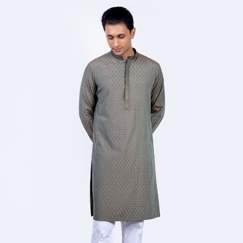 Bring a touch of tradition to your wardrobe with this Classic Panjabi. Made from 100% soft and breathable cotton, it is perfect for any occasion. The Panjabi features gorgeous designs, adding a touch of elegance to the simple yet sophisticated design. The Green color is neutral and versatile, making it easy to style. With a comfortable Regular fit, it is both practical and stylish. Available in sizes 38 to 46, you’re sure to find the perfect size for you.