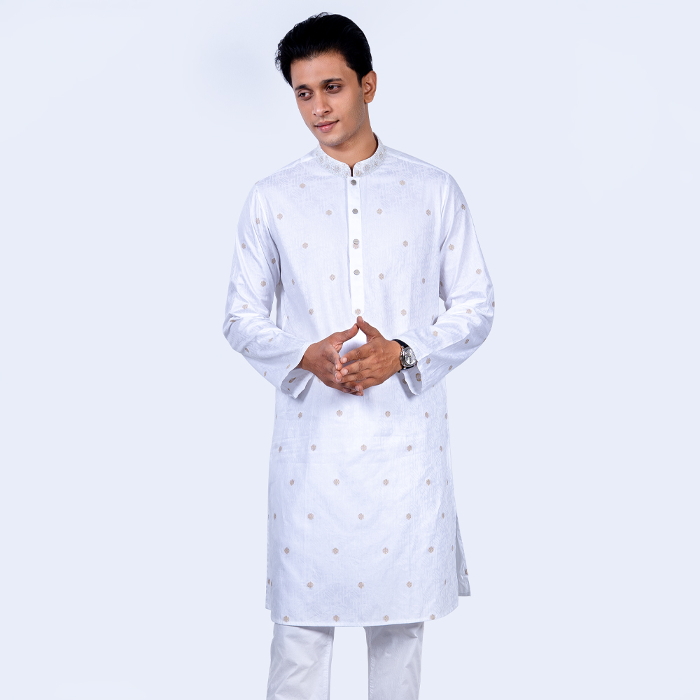 Bring a touch of tradition to your wardrobe with this Premium Panjabi. Made from 100% soft and breathable cotton, it is perfect for any occasion. The Panjabi features gorgeous designs, adding a touch of elegance to the simple yet sophisticated design. The White color is neutral and versatile, making it easy to style. With a comfortable Regular fit, it is both practical and stylish. Available in sizes 38 to 46, you’re sure to find the perfect size for you.
