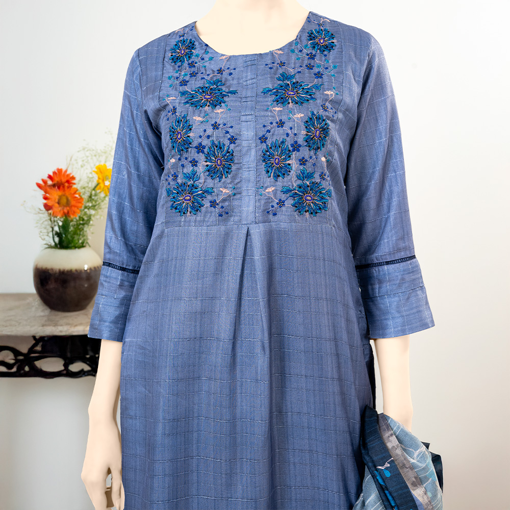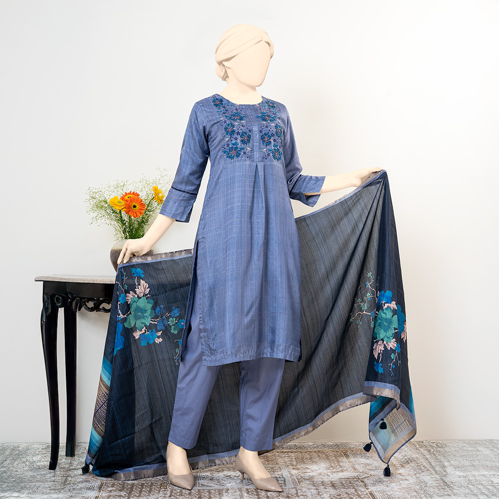 Elevate your festive wardrobe with this luxury 3-piece women’s salwar kameez set crafted from premium silk fabric by Muslin. Designed in a rich Ash color, the ensemble reflects timeless elegance with a festive appeal.