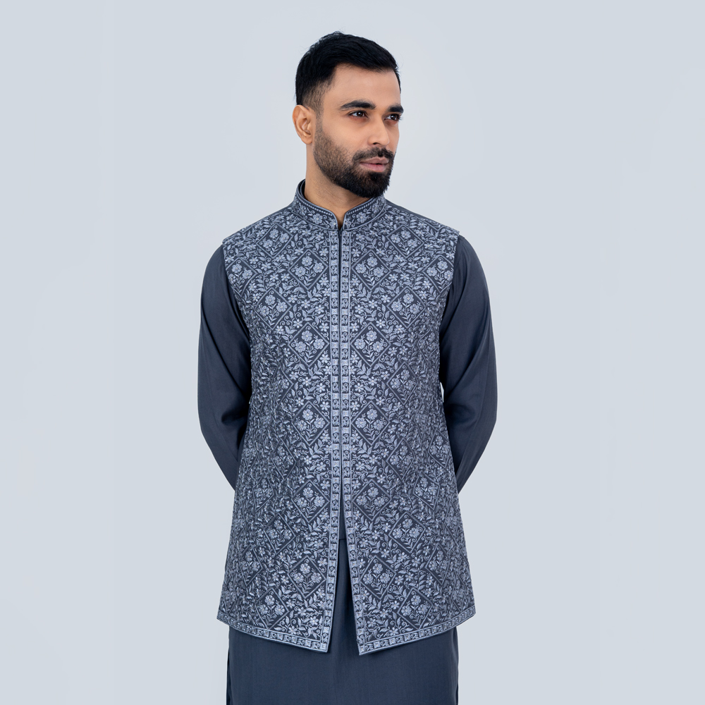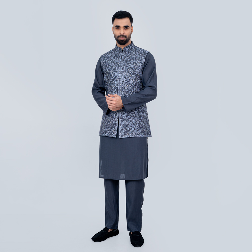 The centerpiece of this set is the fully embroidered Kotty, beautifully designed to showcase fine craftsmanship and cultural artistry. Its elegant Ash color adds a subtle yet striking contrast, making it versatile and stylish.