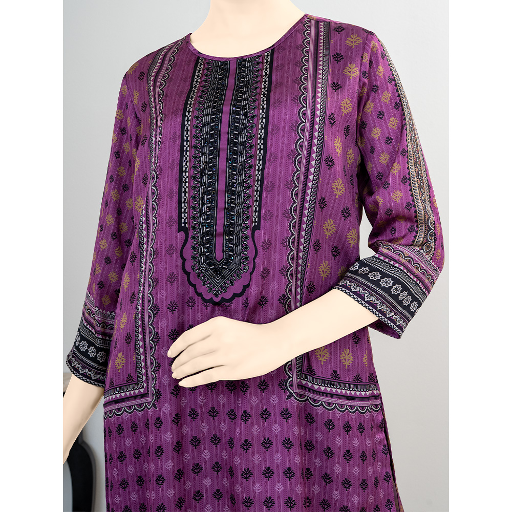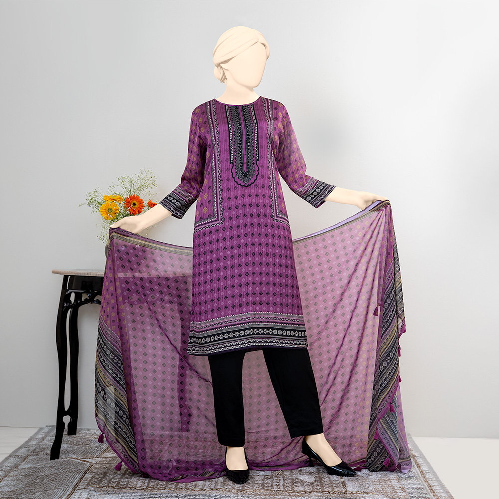 Elevate your festive wardrobe with this luxury 3-piece women’s salwar kameez set crafted from premium Silk fabric by Muslin. Designed in a rich Purple color, the ensemble reflects timeless elegance with a festive appeal.