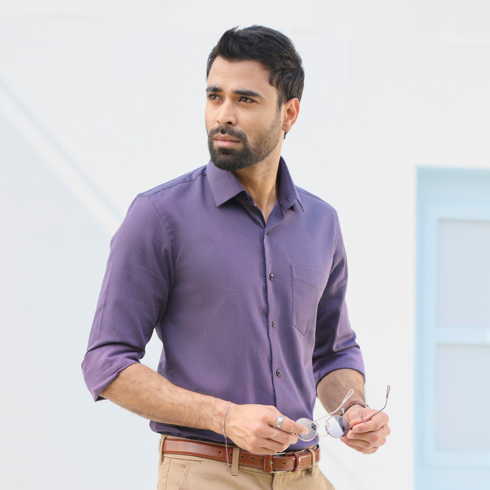 The regular fit silhouette offers a balanced cut — neither too slim nor too loose — providing ease of movement without compromising on structure. Its refined purple shade adds a touch of sophistication and confidence to your formal attire, pairing seamlessly with charcoal, navy, or black trousers.
